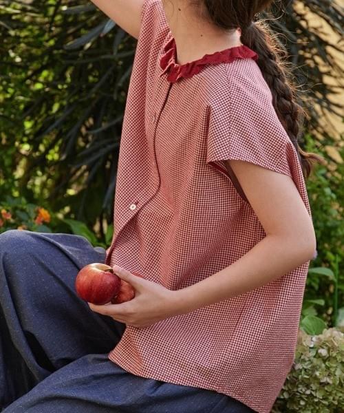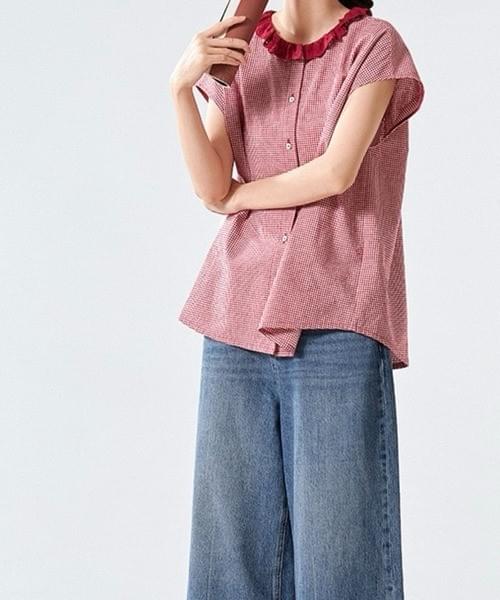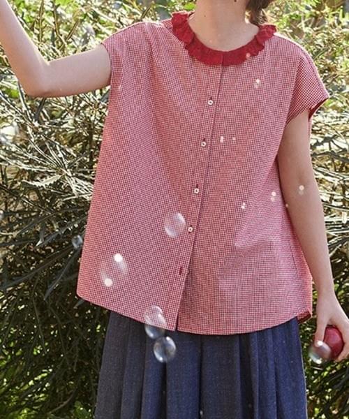 クラシックな細かいギンガムチェックに、繊細なフリル襟を添えたショートスリーブシャツ。
