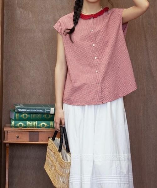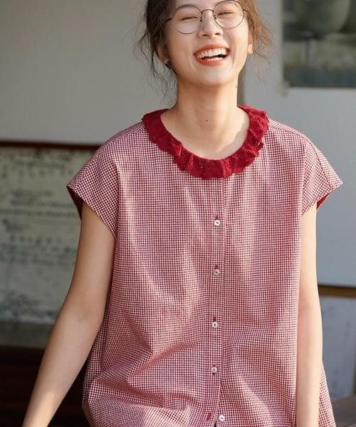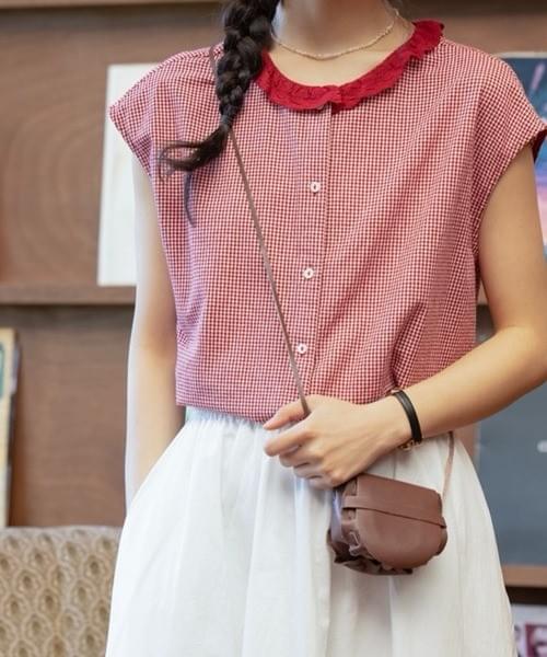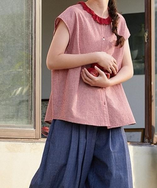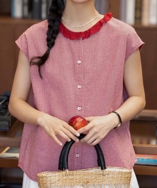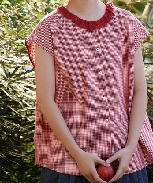 2色展開|小さなフリルと細チェックの前開きシャツ|レッド