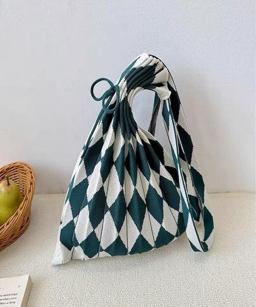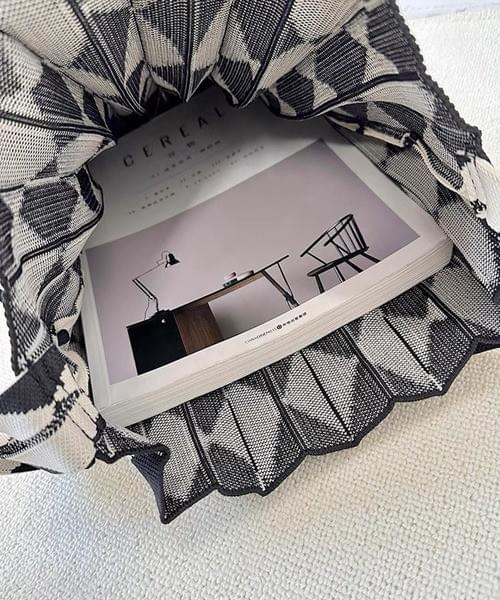 プリーツのように折り重なるデザインが目を引く、ニット素材の2WAYトートバッグ。