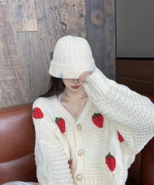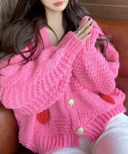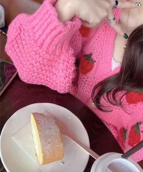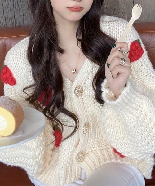 立体感のあるいちごモチーフが目を惹くニットカーディガン。