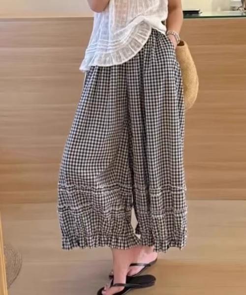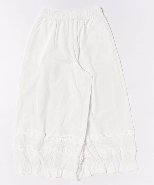 裾部分にあしらわれたレースフリルがポイントのワイドパンツ。