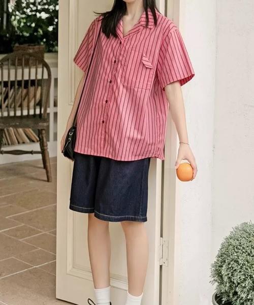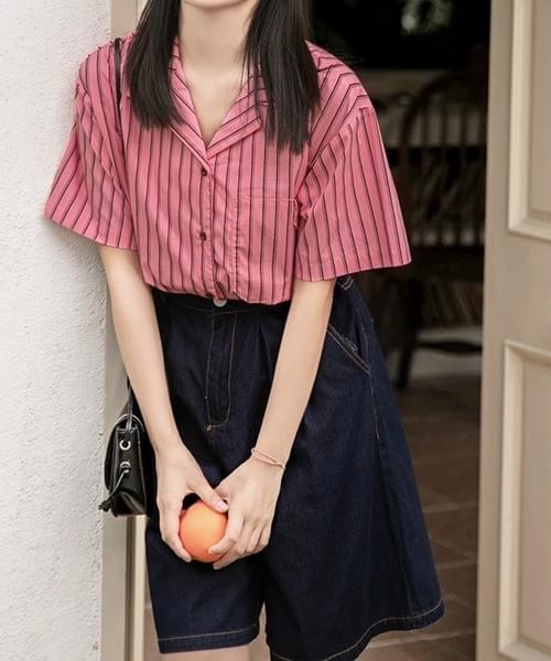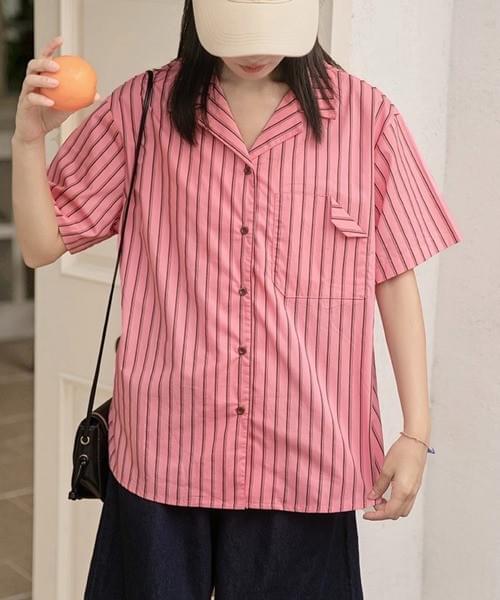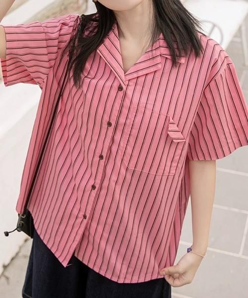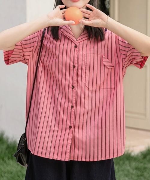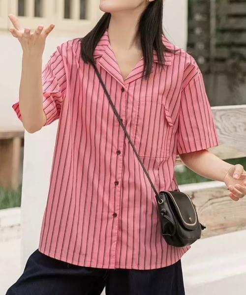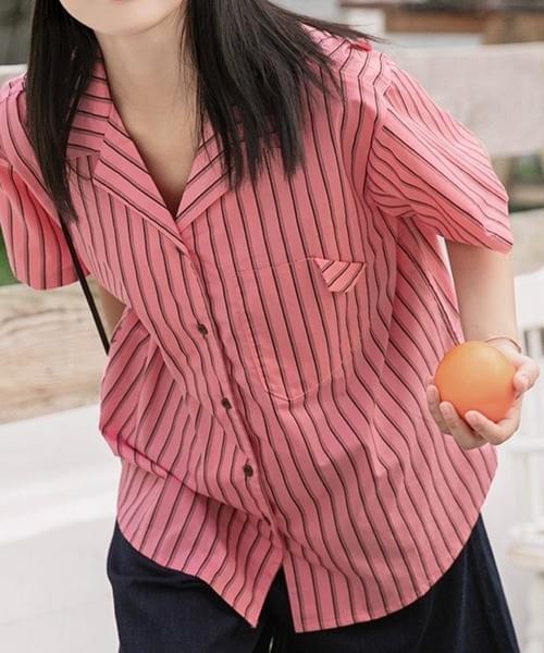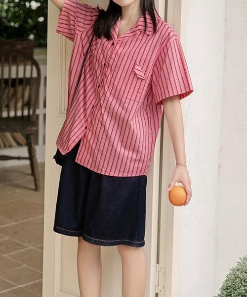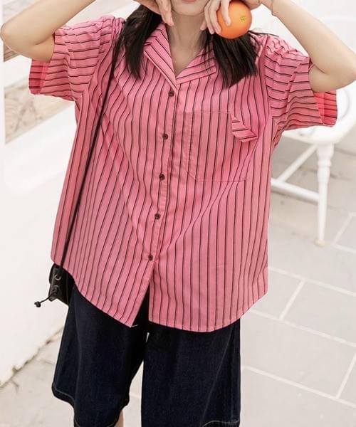 ピンクⅹブラックストライプ半袖シャツ