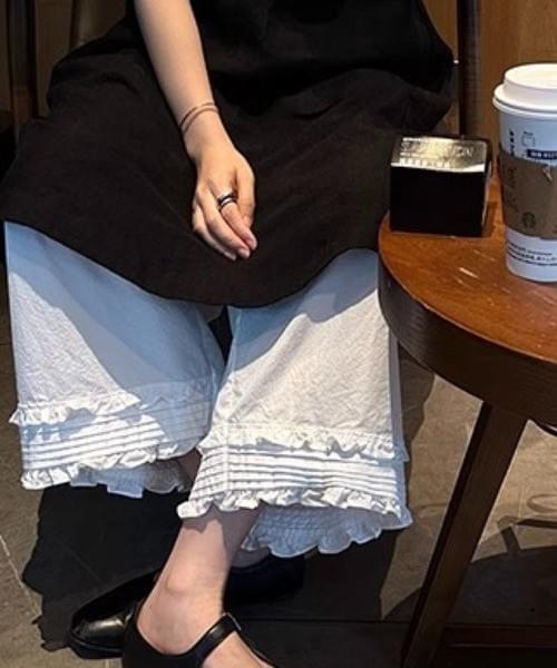裾には繊細な三段フリルを施し、動くたびにさりげなく揺れるシルエットが印象的。