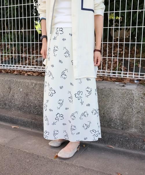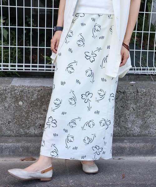 モノトーンフラワープリントIラインロングスカート/大人カジュアル