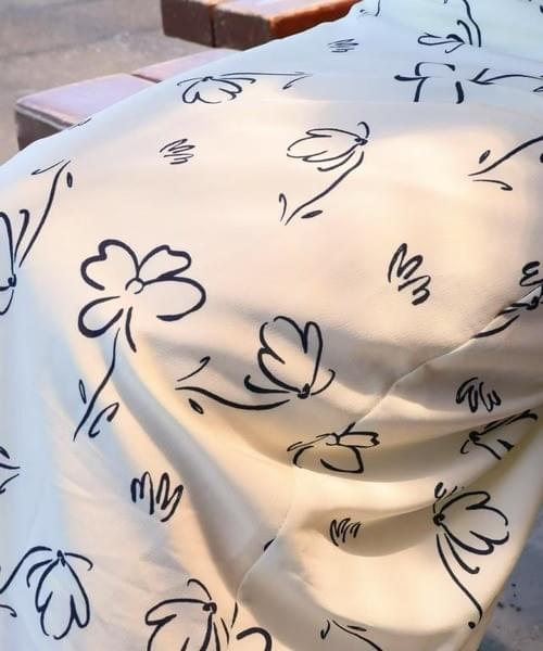 ホワイト地に手描き風のブラックフラワープリント