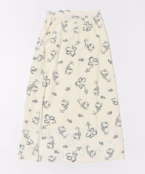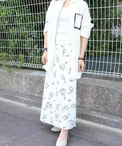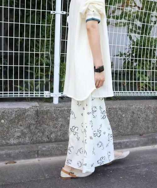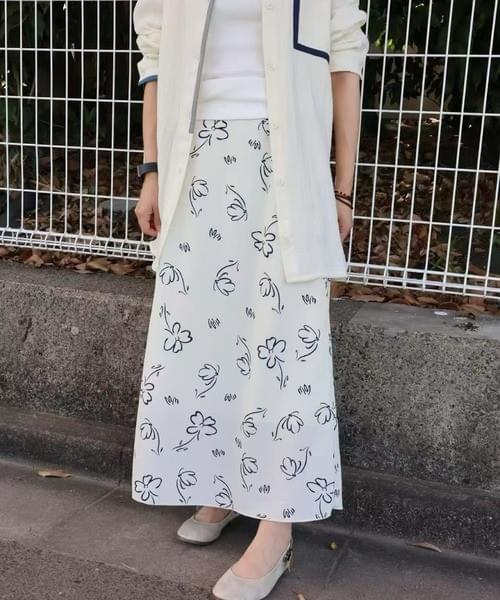 シンプルながら印象的なモノトーンのフラワープリントが魅力のロングスカート。