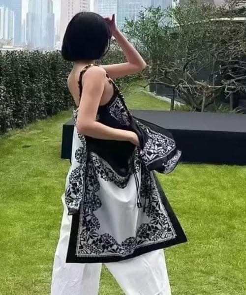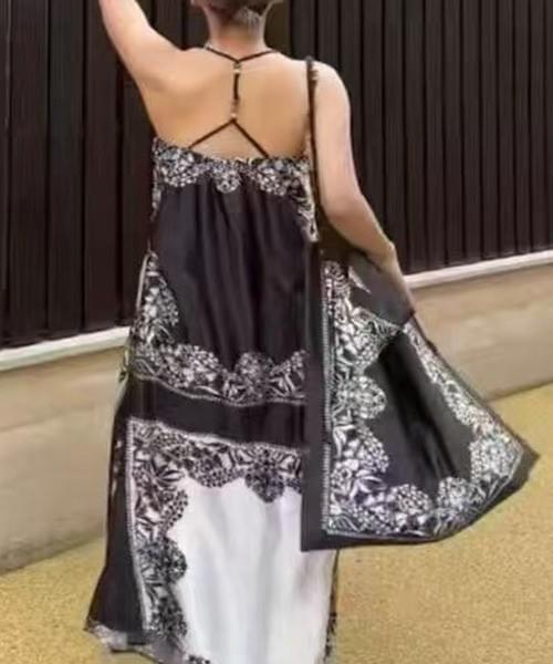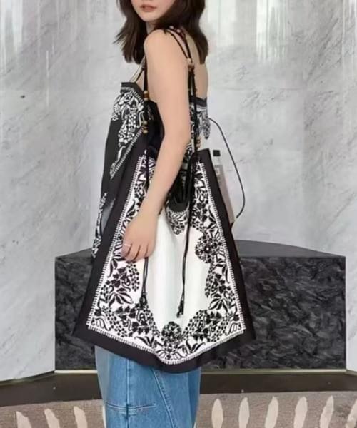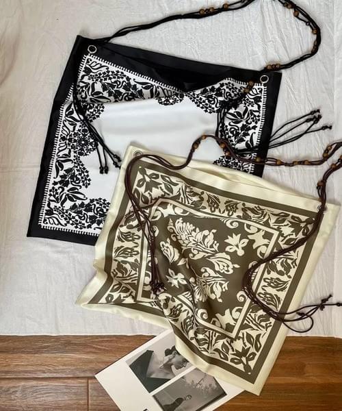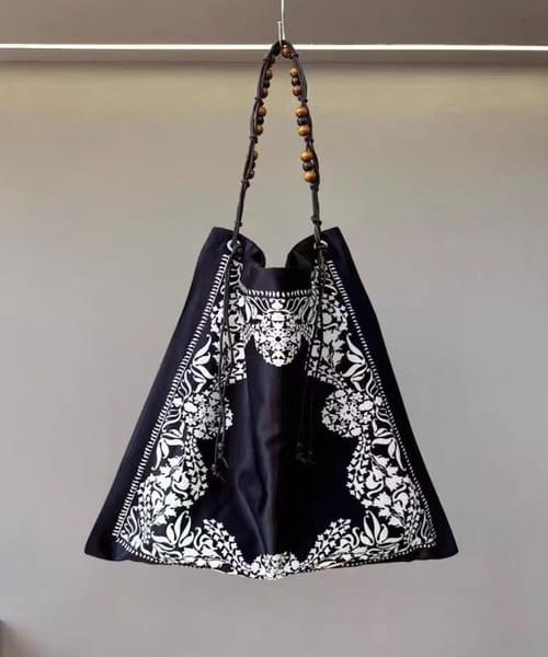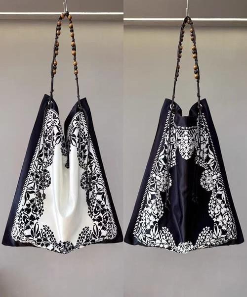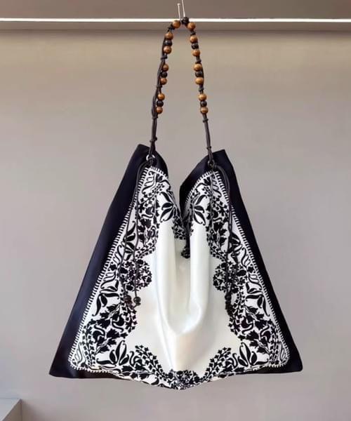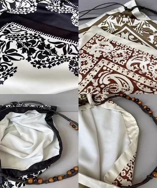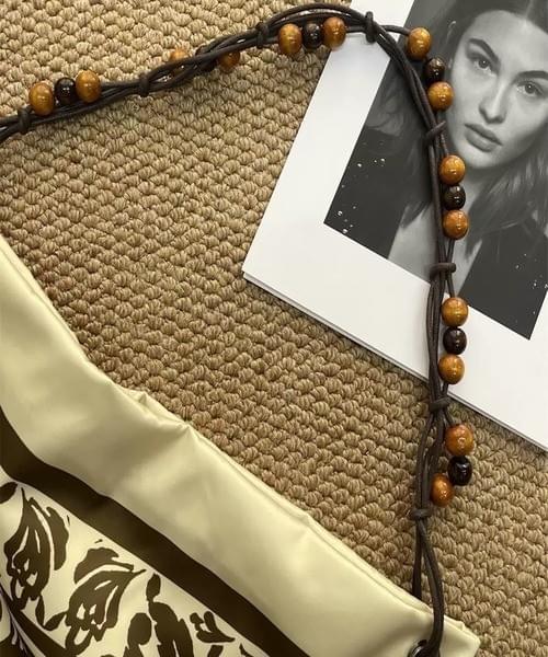 シルクスカーフのような繊細な柄と、ウッドビーズの持ち手が目を引くショルダーバッグ。